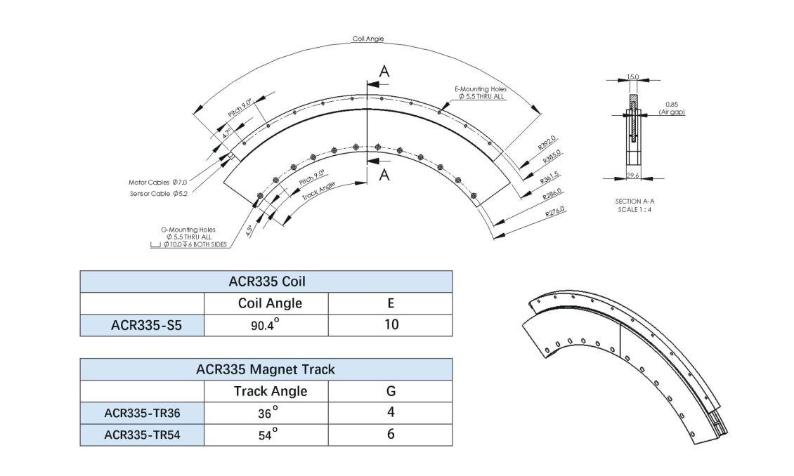 ACR系列弧形无框电机采用高性能永磁材料,经过电磁和机械优化设计,具有厚度小、中孔大、转矩密度高和无齿槽效应等优点,可以根据应用需求灵活配置多个线圈和多个导轨。可应用在FPD加工和表面检测等诸多应用场合。