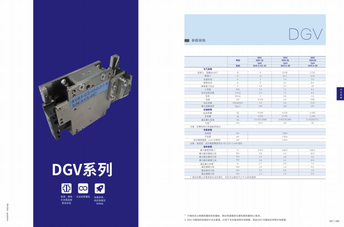 DGV系列(双导轨音圈平台)采用Akribis矩形音圈电机系统,具有高响应和高带宽的特点。适用于短程高频的应用。